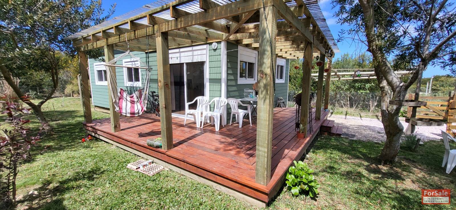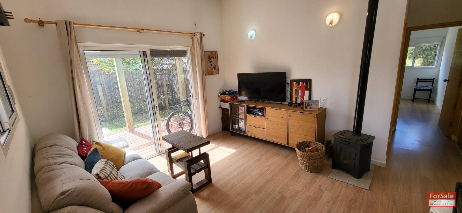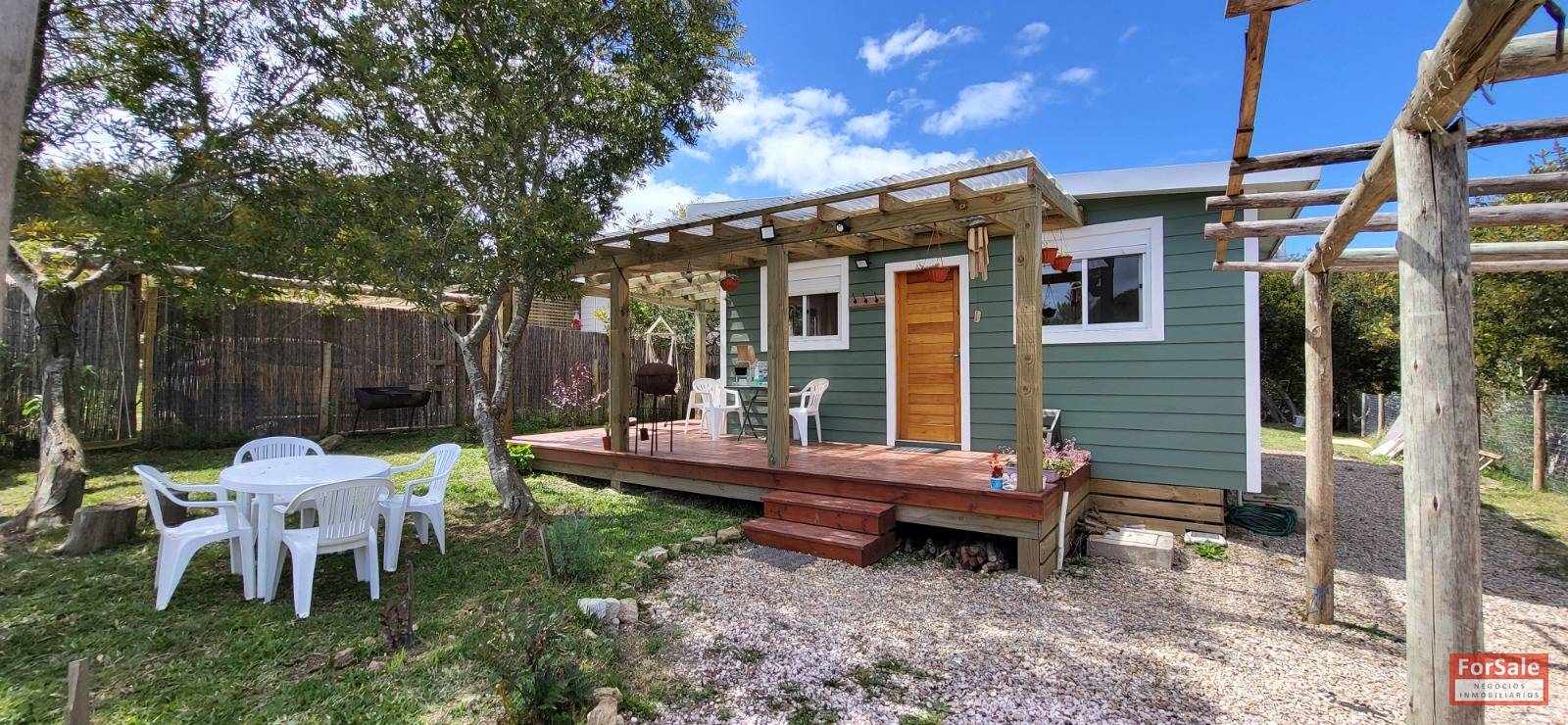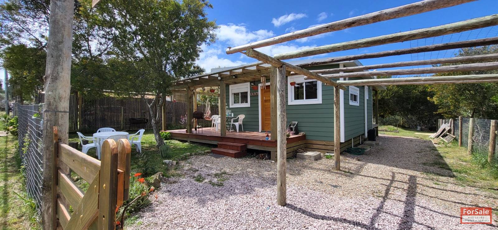 Its features are a living room with a fireplace, kitchen-dining room, two bedrooms and a full social bathroom. Both in front and on the side, it has a solid and large covered deck.