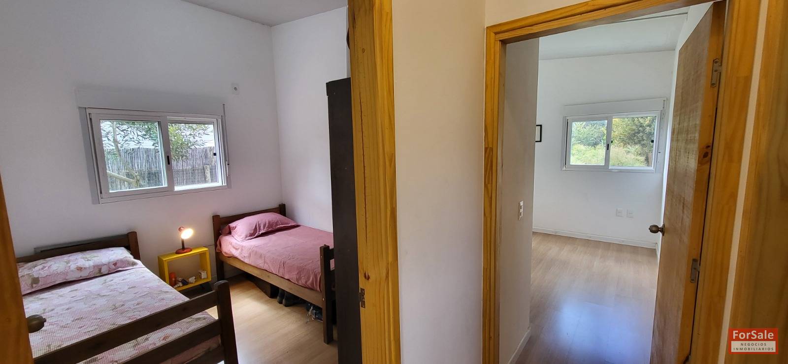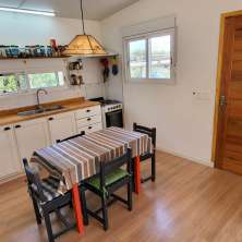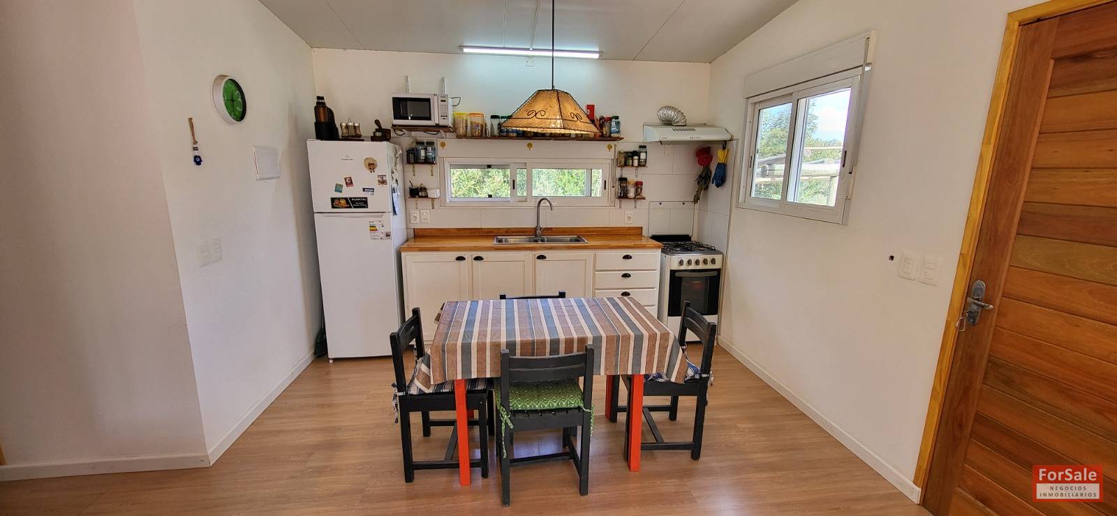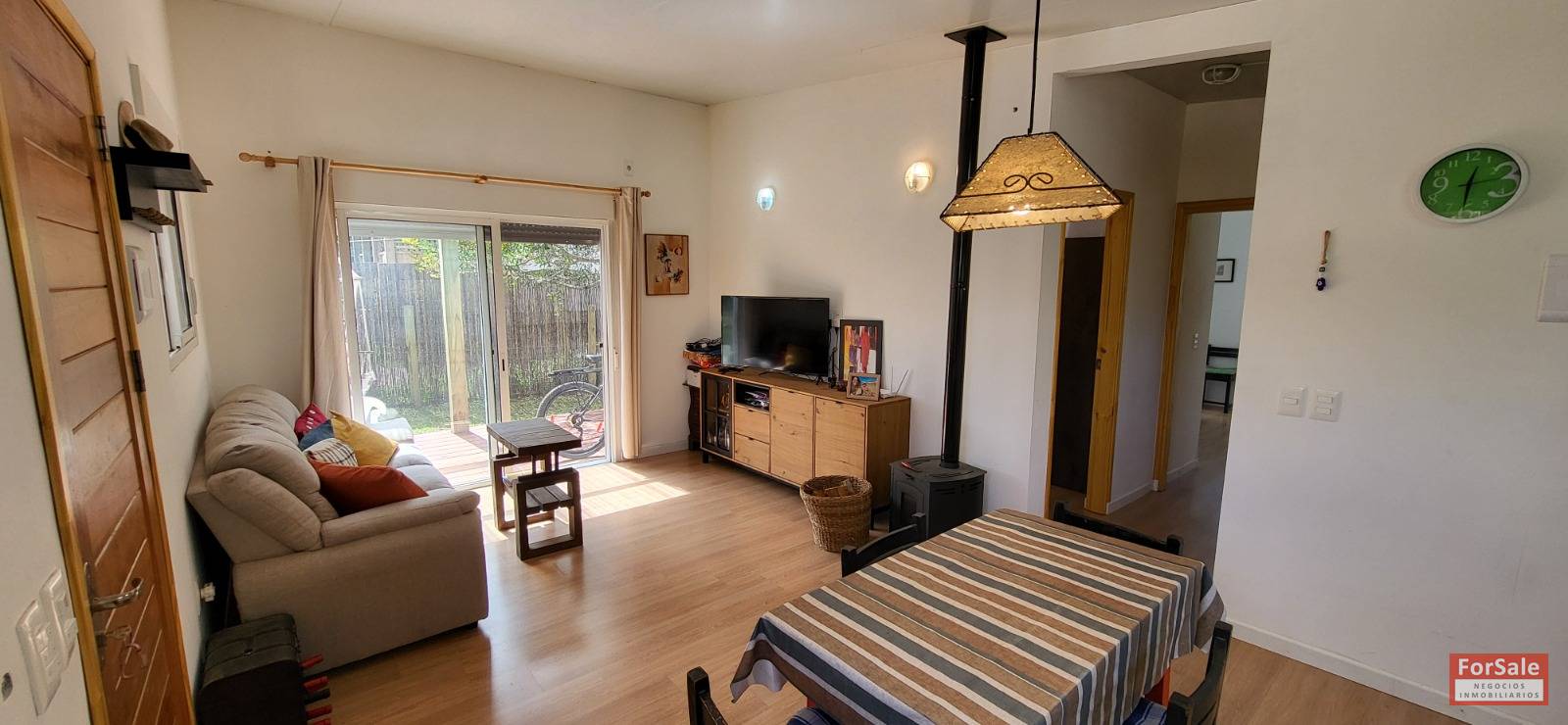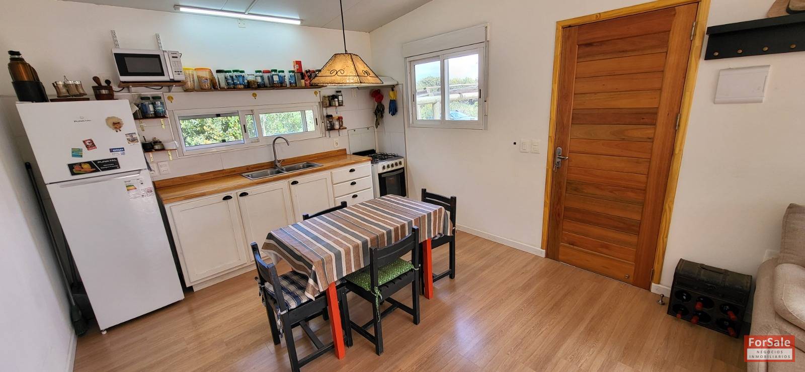 Its features are a living room with a fireplace, kitchen-dining room, two bedrooms and a full social bathroom. Both in front and on the side, it has a solid and large covered deck.